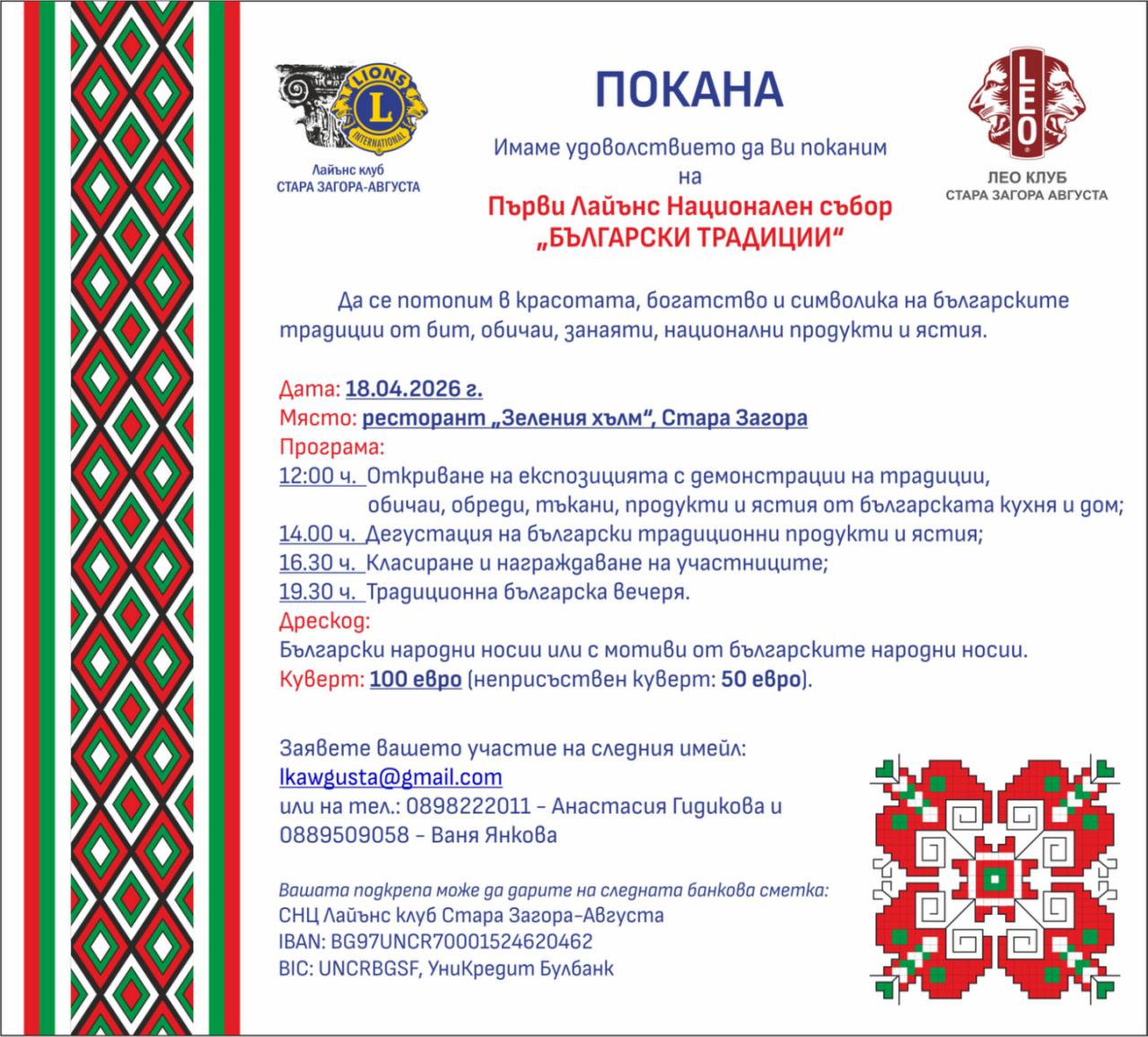 Къде : гр. Стара Загора Лайънс клуб Стара Загора Августа Ви кани на Първи Национален Лайънс събор "Български традиции".
